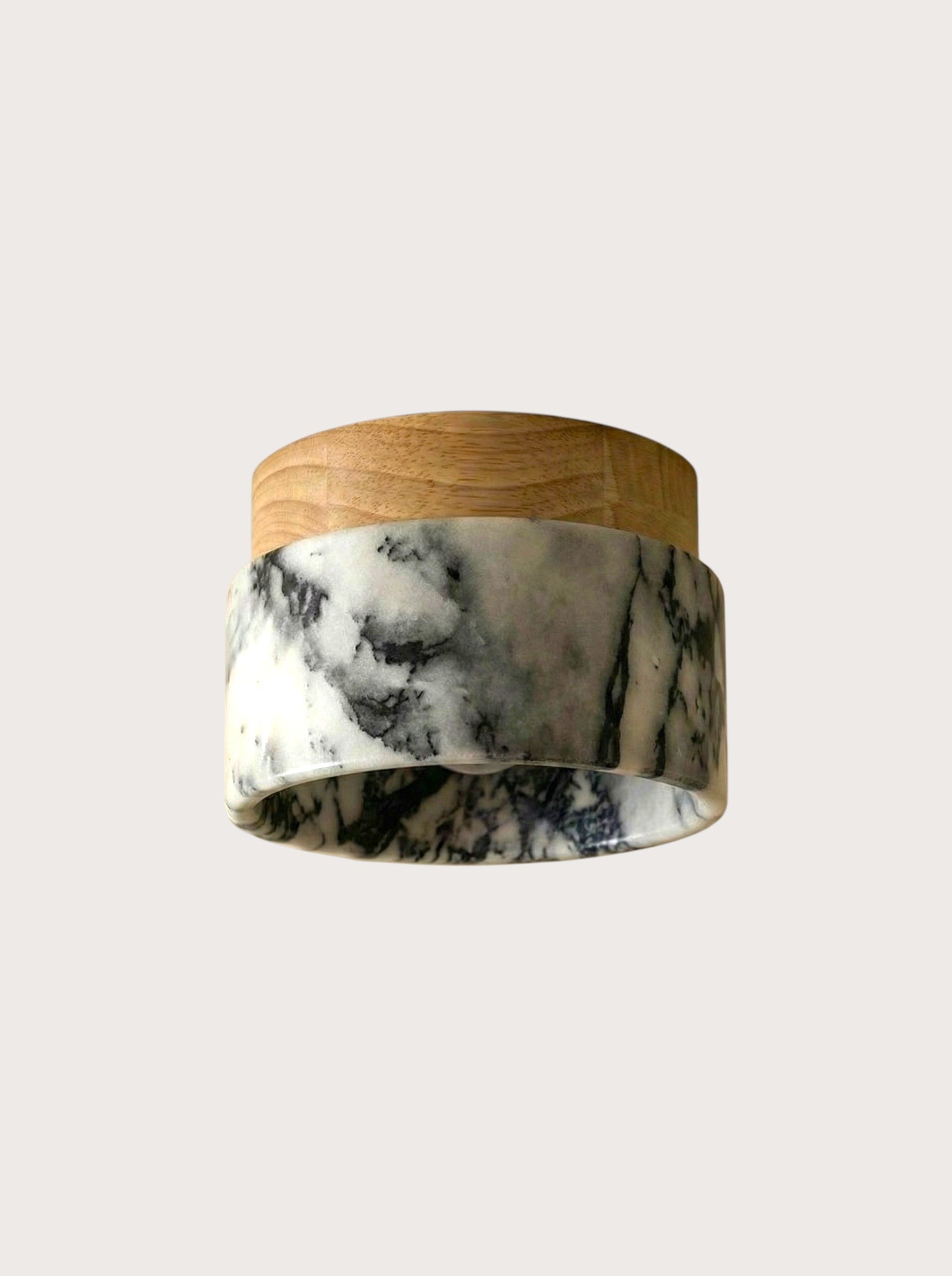 De Mito plafondlamp van Ted & Martin is een stijlvolle toevoeging aan elk interieur. Met een kap van massieve calacatta en een houten plafondplaat in eiken of noten, brengt deze lamp warmte, textuur en eenvoud samen in één ontwerp. De diepere nerf van de natuursteen in combinatie met het zachte licht zorgt voor een rustgevende sfeer in de ruimte.