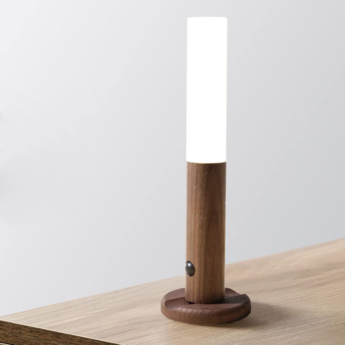 De Miri wandlamp ademt eenvoud: een slanke cilindervorm in warme walnootlook, zonder zichtbare bevestiging of knoppen. Het ontwerp past naadloos in minimalistische, natuurlijke en Japandi-interieurs. Miri is ontworpen om op te gaan in je ruimte – tot je haar nodig hebt.